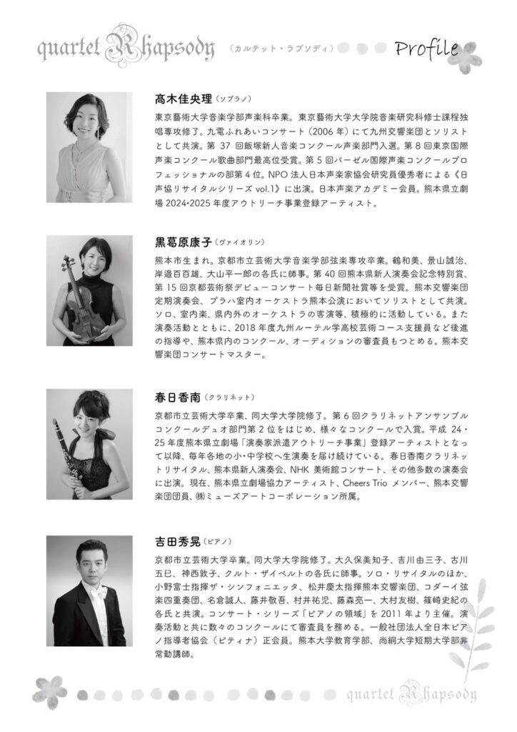 黒葛原康子(ヴァイオリン)、春日香南(クラリネット)、吉田秀晃(ピアノ)、高木佳央理(ソプラノ)